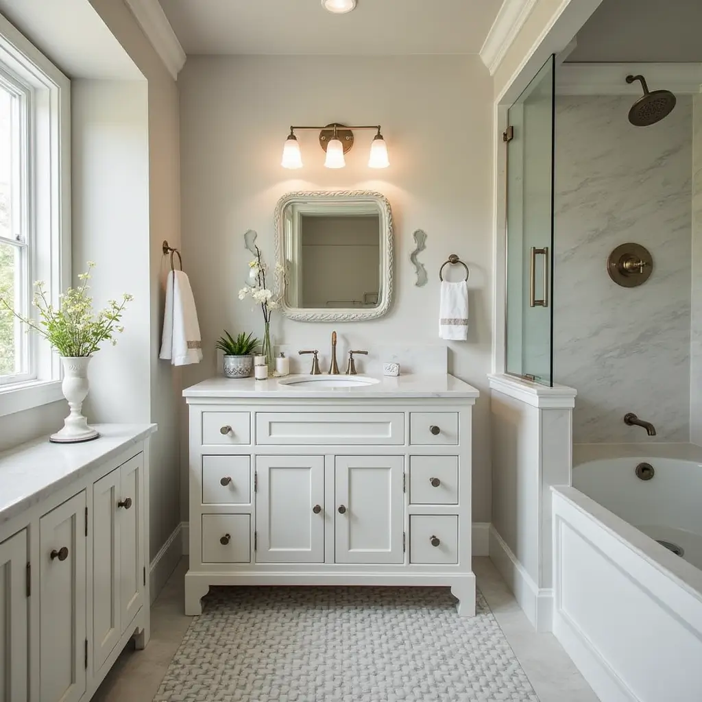 Adding statement pieces and focal points can make your bathroom stand out. You can choose unique elements that show off your style. A big, ornate mirror or a decorative mirror with an interesting shape can be a great focal point.