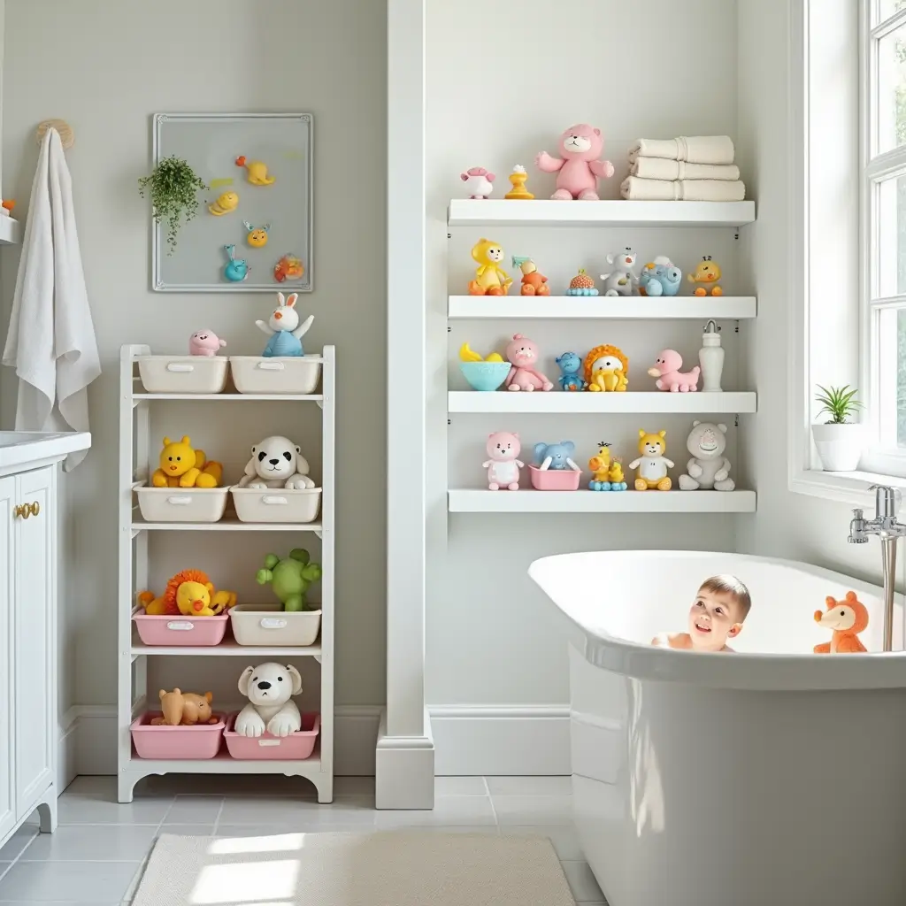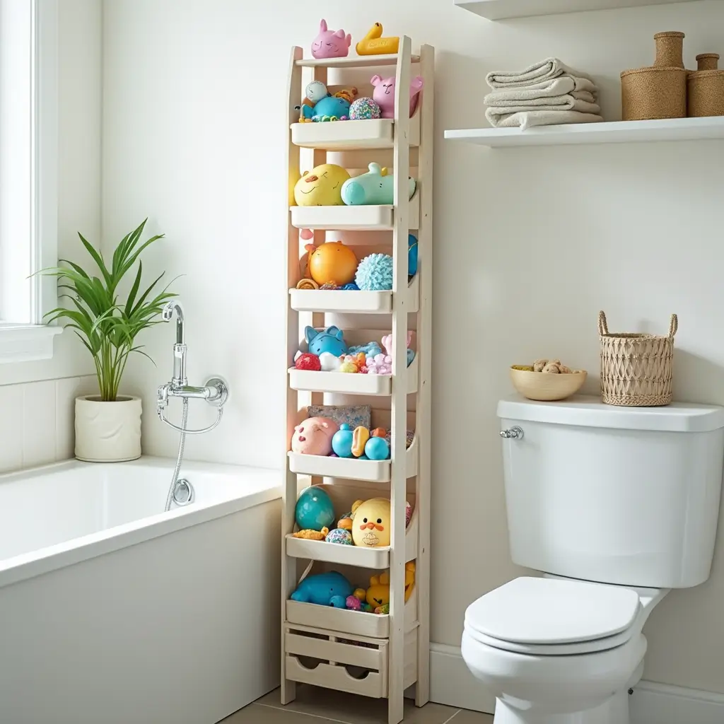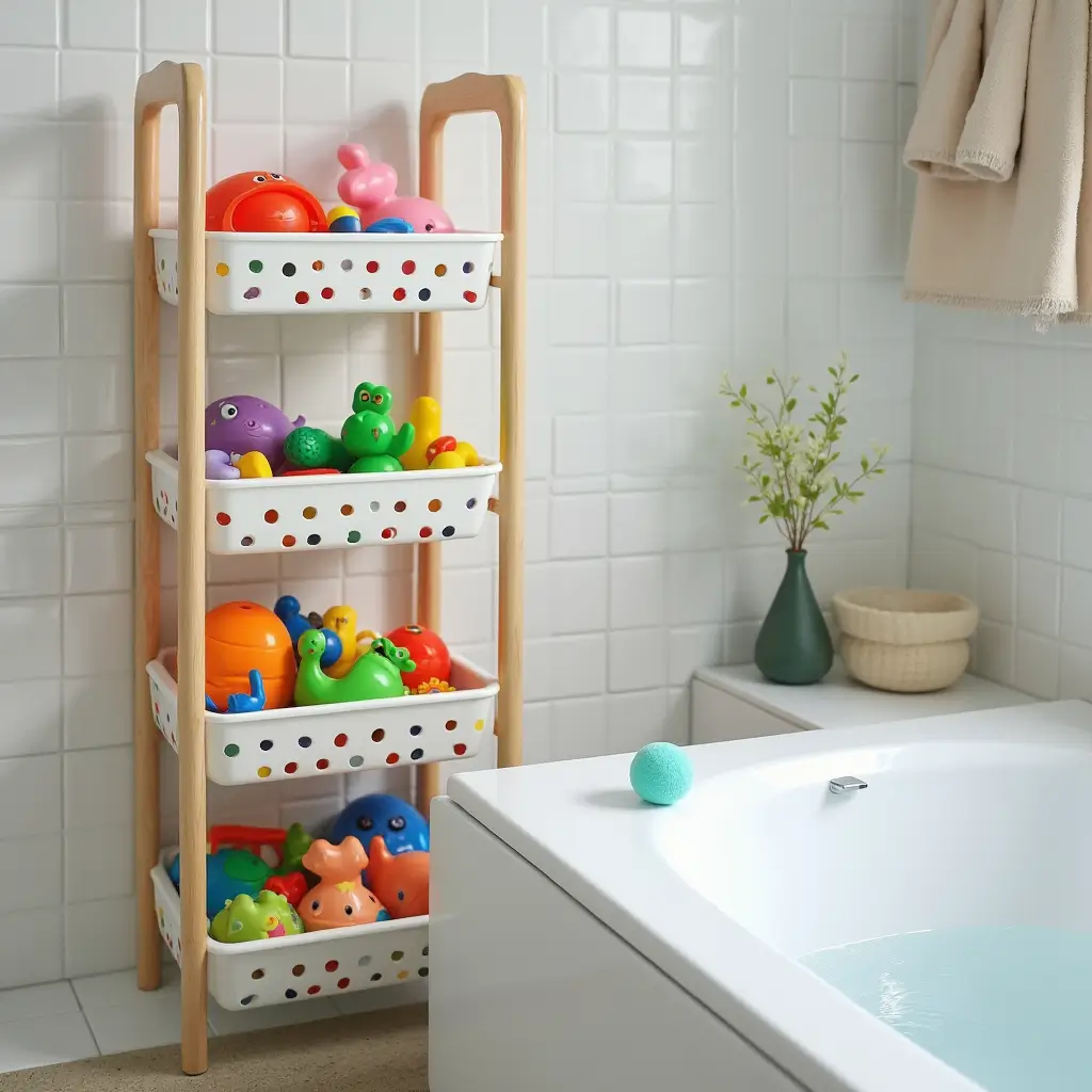 Whether it’s a wall organizer, a hanging caddy, or a freestanding unit, find what works best. It should save space, make toys easy to find, and match your bathroom’s style.